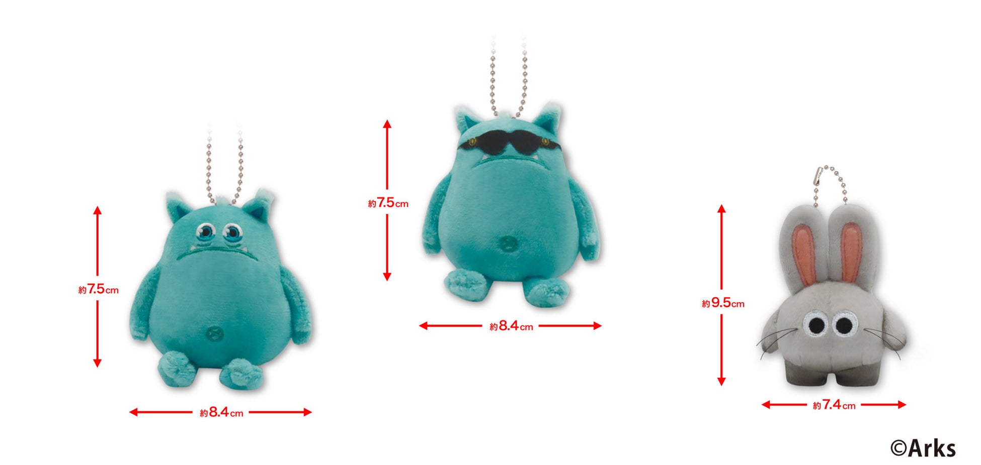 ノーマルなふーごんとサングラスをかけたふーごん、ジョーのマスコットぬいぐるみ。