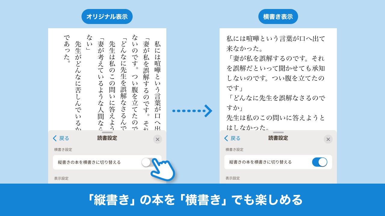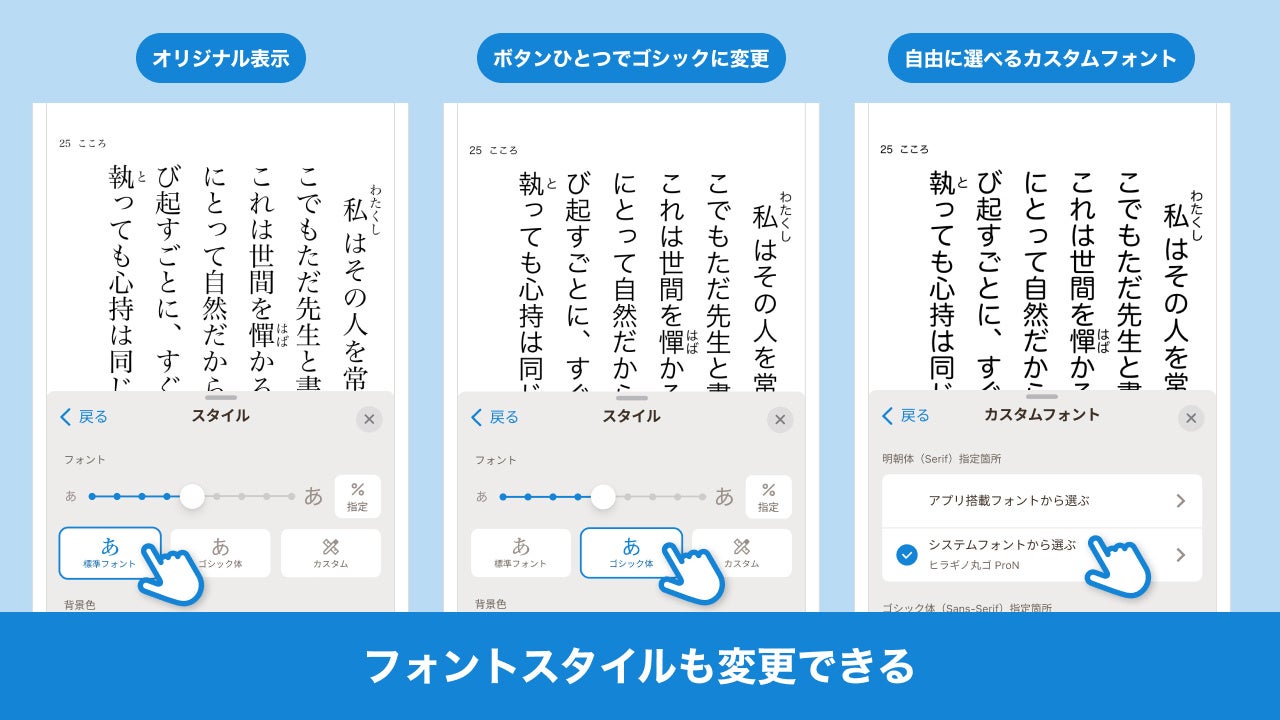 主なリニューアル内容として、要望の多かった「フォント選択」機能を初搭載します。これによりボタンひとつで「ゴシック体」に変更できるなど、好みやシーンに合わせてさまざまなフォントから選択が可能になり、年齢や視力にかかわらず快適な読書を楽しめるようになりました。また、「横書き変更」機能では、「横書きのほうが読みやすい」という声にもお応えし、小説など縦書きの作品を横書きに変更して読めるようになりました。さらに、従来の「ページ移動」や「文字サイズ・背景色変更」機能は、操作内容がリアルタイムで反映され、画面を"見ながら"調整できる直感的な仕様に進化しました。
