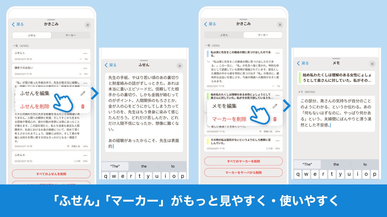 内容:読書中に多くの文字をメモできる「ふせん」機能や、気になった文