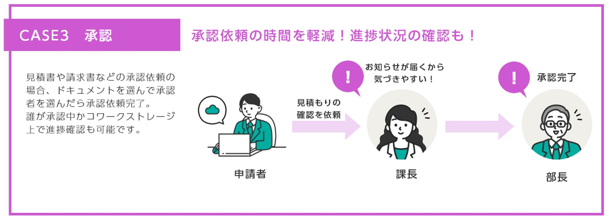「コワークストレージプラス」をご利用いただくことで、ドキュメントの内容確認・承認などの日常のドキュメントに関わるコミュニケーションをさらに円滑にするとともに、ファイル・フォルダ整理の半自動化による稼働削減を実現します。