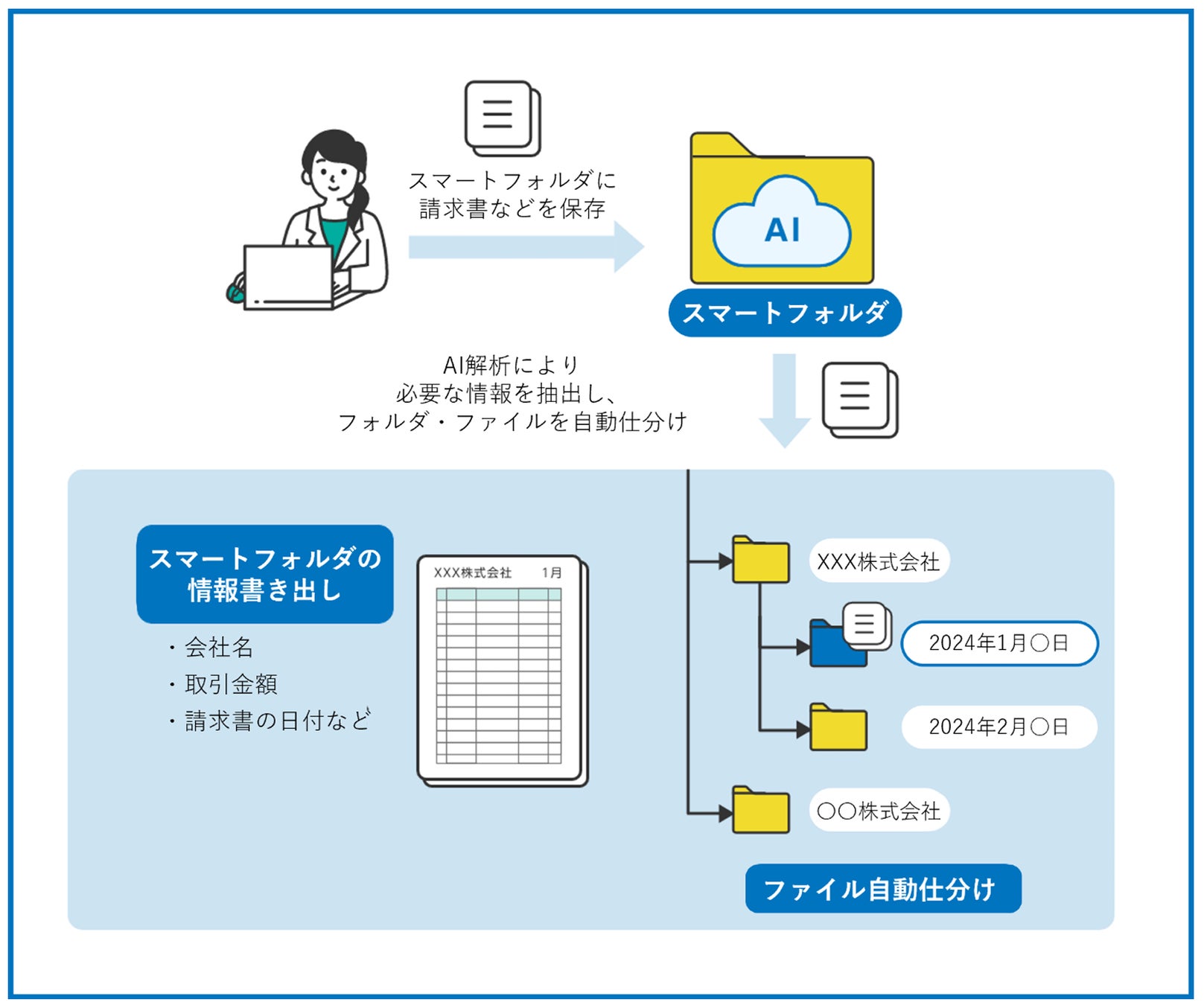 特定フォルダにファイルを保存するとAIが解析し、自動的に必要な情報を抽出し、抽出した情報に基づきフォルダ・ファイルを整理してくれる機能です。本機能を活用いただくことで、取引先企業名等の補足情報をファイルのプロパティへ追加することやフォルダへの格納などの定型業務を自動化し、稼働削減を実現します。提供開始時点では、お客さまからのご要望が多かった電子帳簿保存法に対応するデータ保管業務を支援するシナリオを提供いたします。今後、お客さまからのご要望に応じて、さまざまなシナリオ※2を追加予定です。