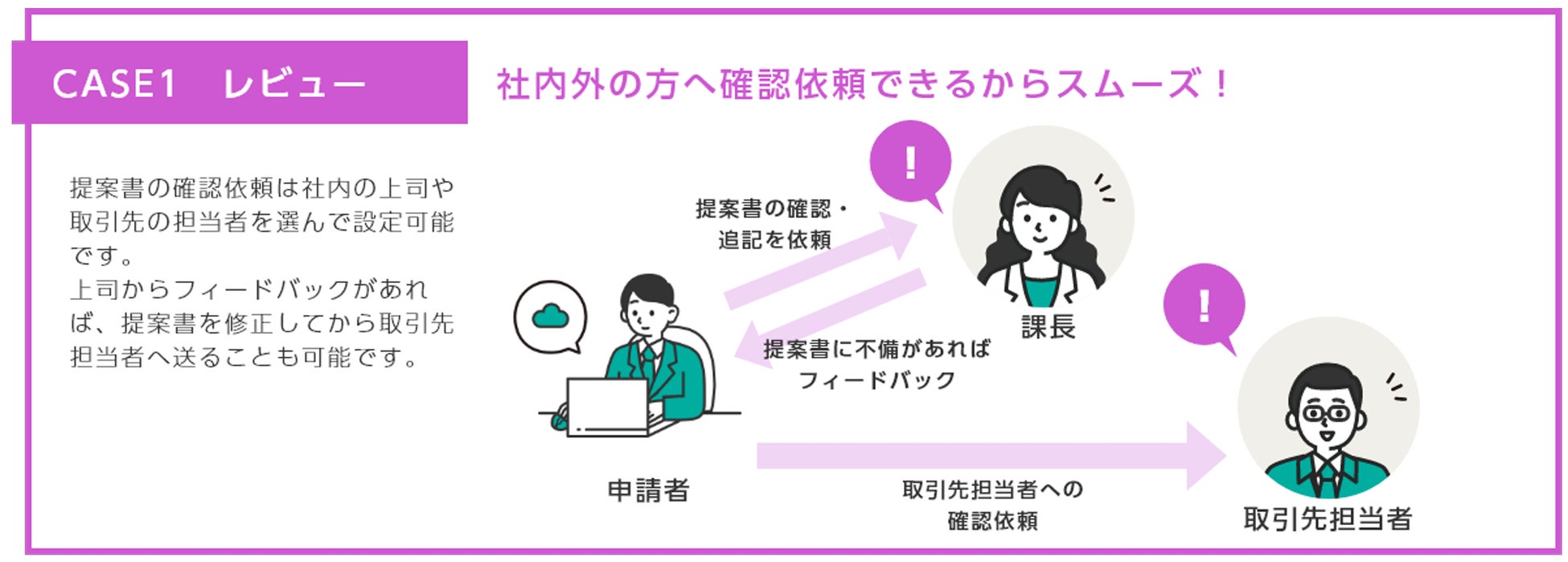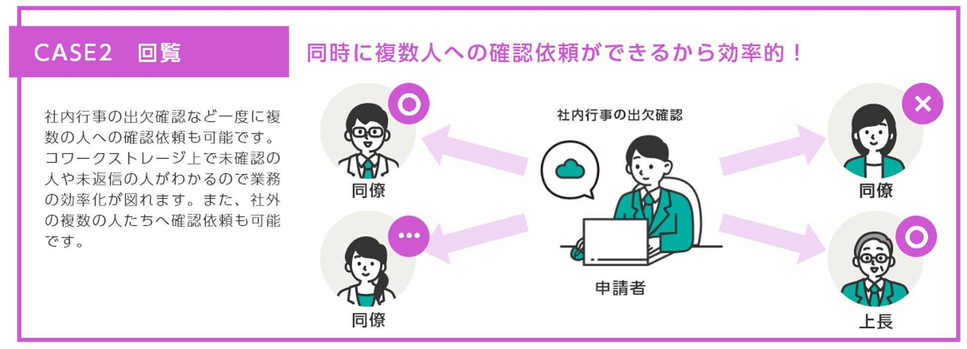 ドキュメントに関わる「申請・承認」「レビュー」「回覧」等の業務フローをコワークストレージ上で実行する機能です。普段、メールや電話等でやり取りしているドキュメントに関わるコミュニケーションについて、本機能を用いることで、コワークストレージ上で「漏れなく・無駄なく・効率よく」完結することが可能となります。申請前に業務フローを作りこむ手間もなく、ドキュメントを選択し、数クリックでレビュー等が依頼可能なため、直感的に利用を開始できます。本機能による業務プロセスのデジタル化が、業務DXを前に進める第一歩となります。
