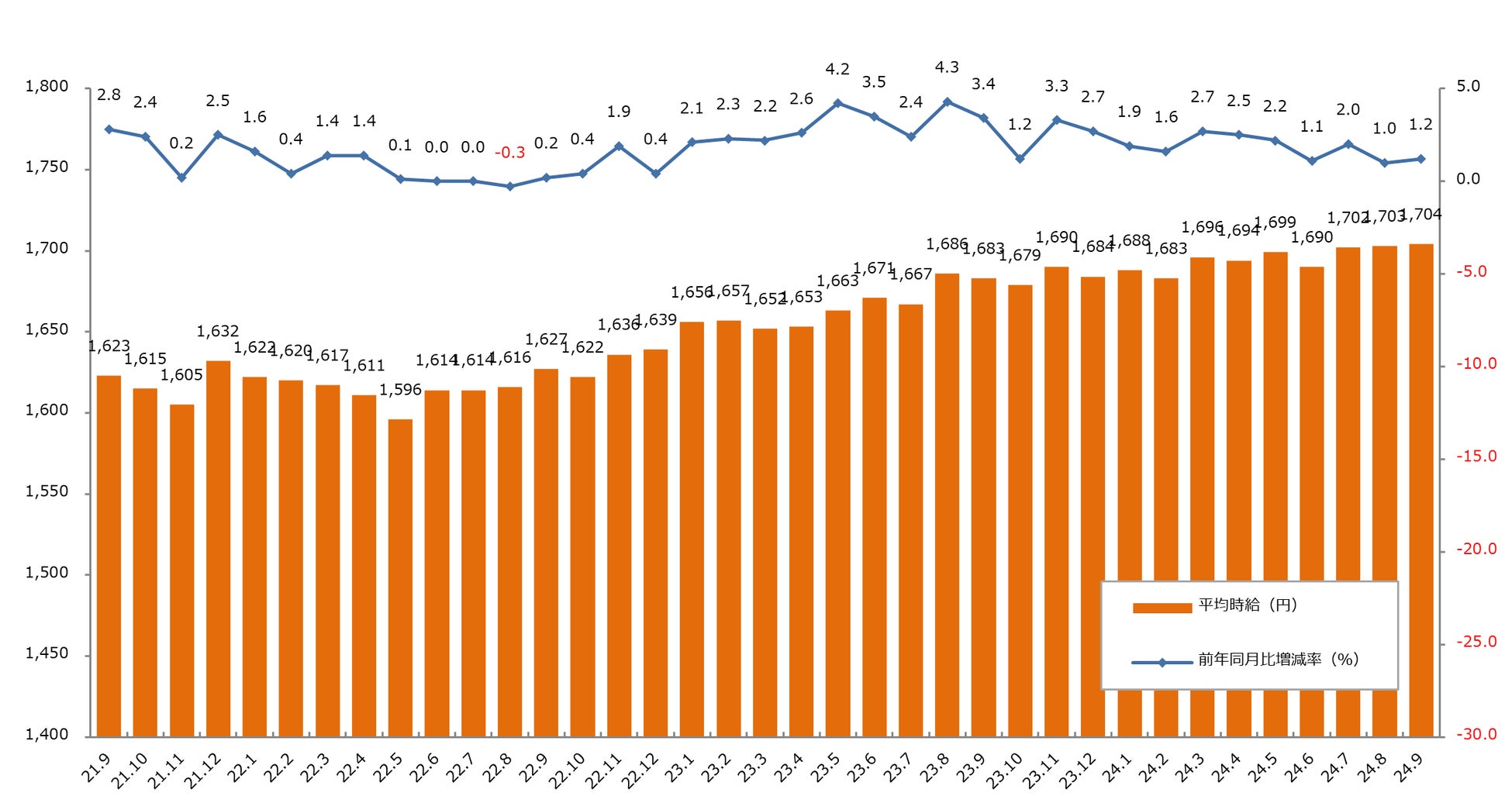 2024年9月度の三大都市圏平均時給は1,704円(前月比+1円・0.1%増、前年同月比+21円・1.2%増)で、3ヵ月連続で過去最高を更新。前年同月比を上回るのは25ヵ月連続です。