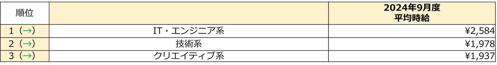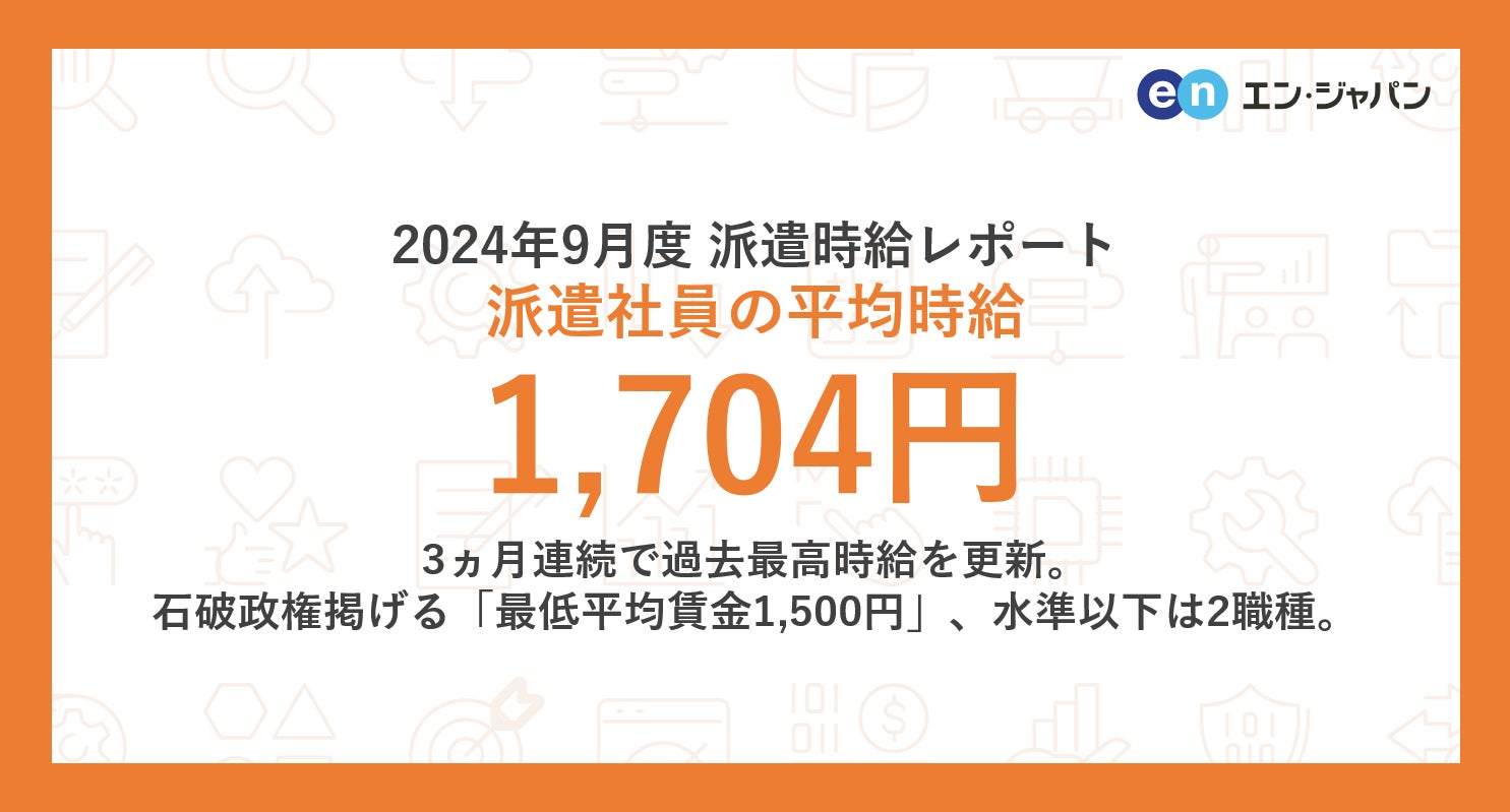 2024年9月度 派遣社員の平均時給は1,704円3ヵ月連続で過去最高時給を更新。石破政権が掲げる「最低平均賃金1,500円」、水準以下は2職種のみ。