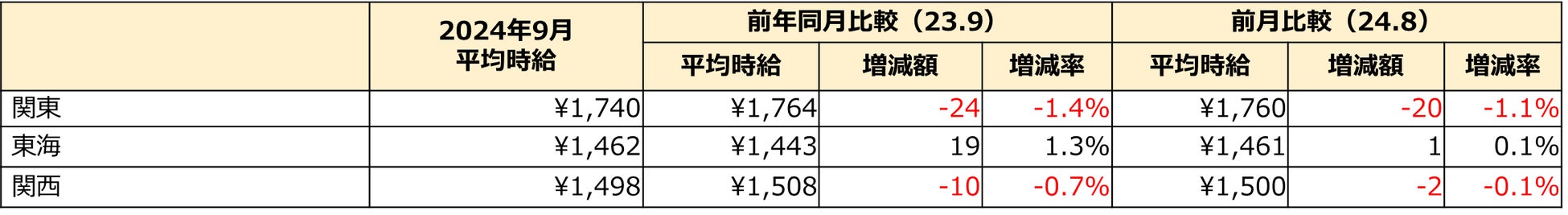 9月度のエリア別平均時給は、東海のみ前年同月比プラスを記録。