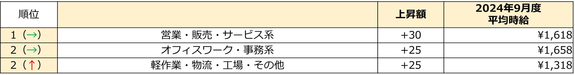 9月度の職種別/前年同月比 時給上昇額ランキング