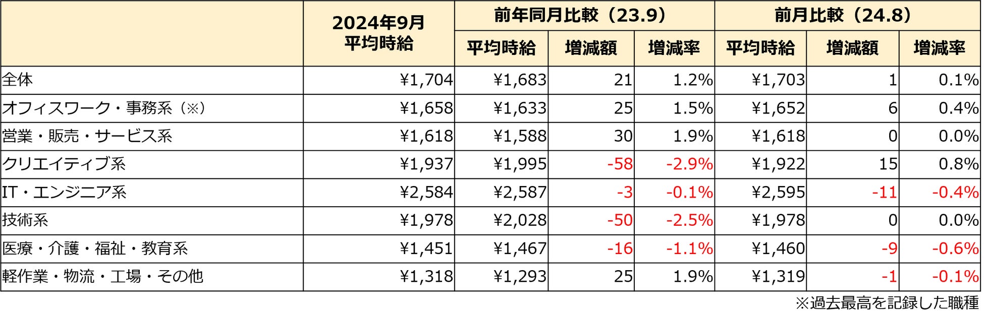 9月度の三大都市圏 職種別平均時給は、【オフィスワーク・事務系】が過去最高に。
