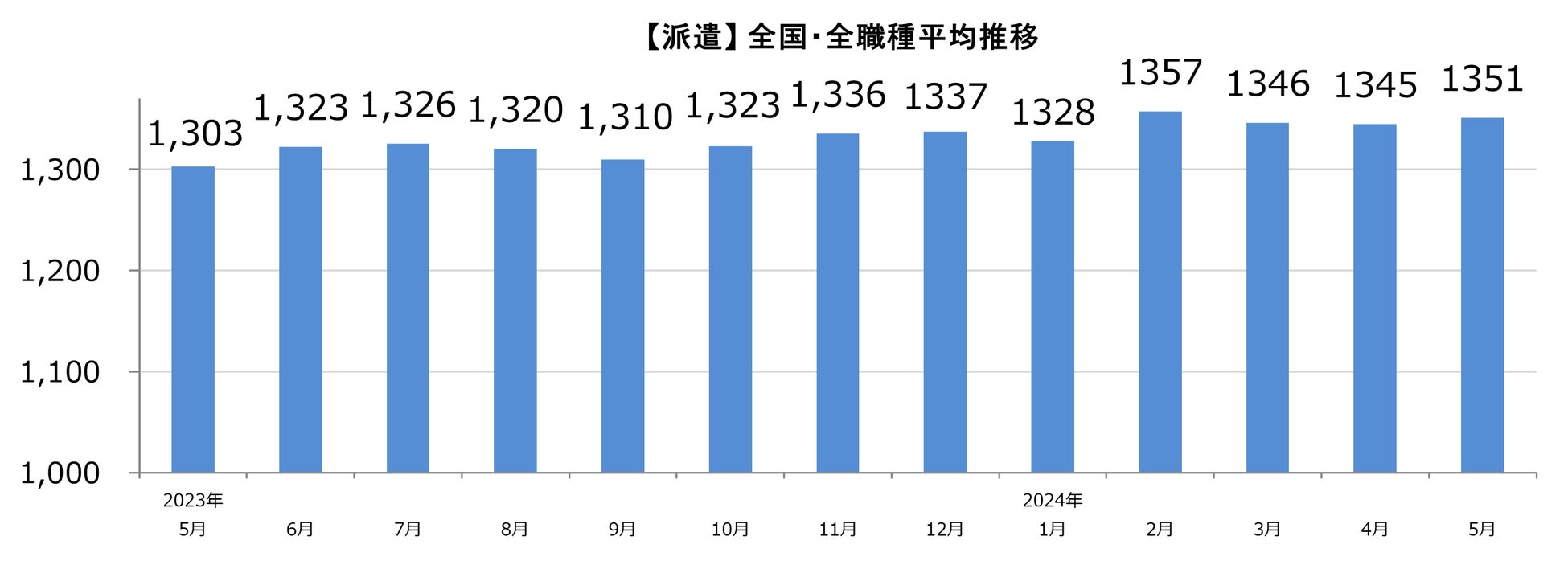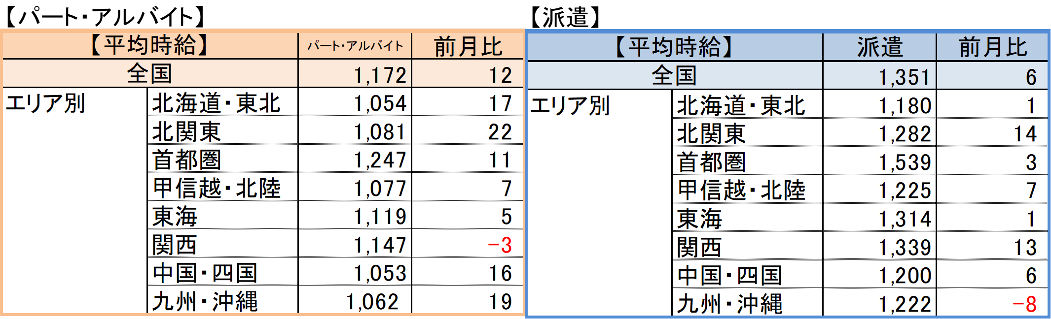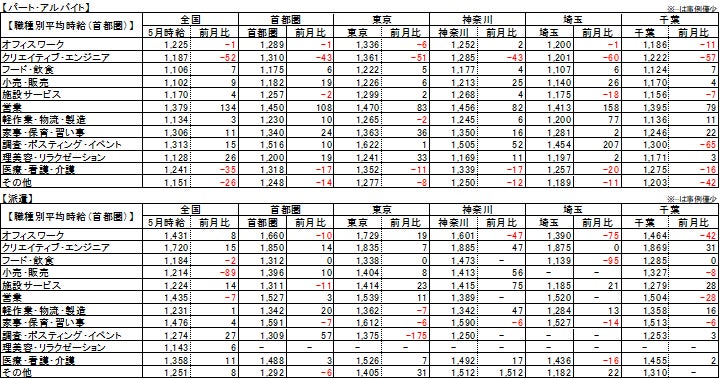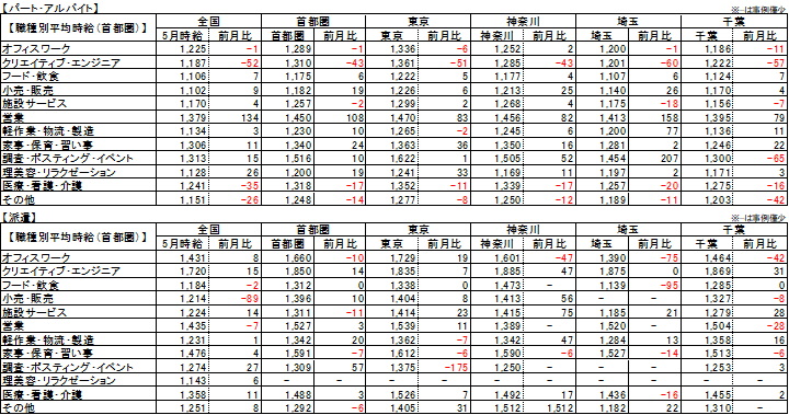 【パート・アルバイト】全国・全職種平均時給は1,172円。前月比+12円。前年同月比+79円。 【派遣】全国・全職種平均時給は1,351円。前月比+6円。前年同月比+48円 パート・アルバイトの平均時給は、同条件で比較可能な2020年9月以降で2番目に高かった。エリア別で見ると、「関西」以外の全エリアで前月を上回った。 引き続き、賃上げの影響を受けており、5月は「フード・飲食(前年同月比+67円)」「施設・サービス(前年同月比+41円)」「営業(前年同月比+151円)」の3カテゴリで、平均時給が過去最高を更新した。 中でも、「フード・飲食」カテゴリの平均時給は、3ヶ月連続で過去最高を更新し、5月は初めて1,100円を超えた。全国展開の大手飲食店でも、時給を上げて求人を掲載する動きが多数見られた。 派遣の平均時給は、2024年3月以降、横ばいが続いている。 |