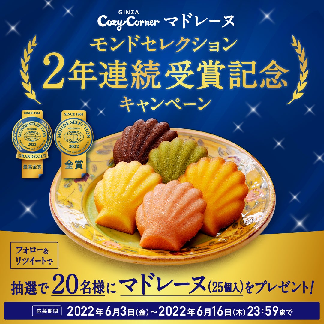株式会社銀座コージーコーナー<代表取締役社長 船田知秀 東京都中央区>は、2022年度モンドセレクションにおいてマドレーヌ全品が受賞したことを記念して、2022年6月3日(金)から公式Twitterでモンドセレクション受賞記念キャンペーンを開催します。