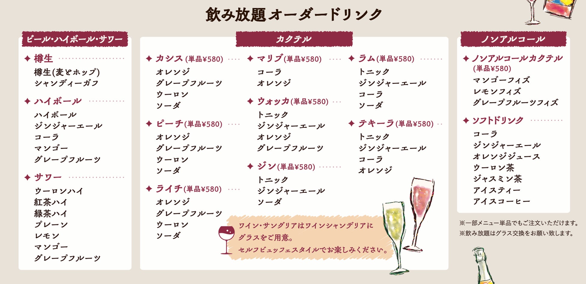 ※全部まとめて飲み放題(ワインビュッフェとソフトドリンク含む対象ドリンク全て)を1,320円(税込)、ソフトドリンク飲み放題を650円(税込)で別途追加いただけます。