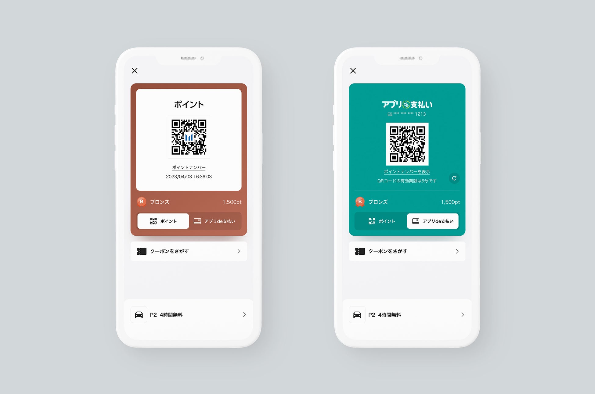 ポイントをためる、つかう、駐車場の事前精算などの機能を「三井ショッピングパーク会員証」としてまとめ、誰でも簡単にアプリから利用ができるようになっています。また「アプリde支払い」(QRコード決済)に登録すれば、クレジット支払いもご利用いただけます。