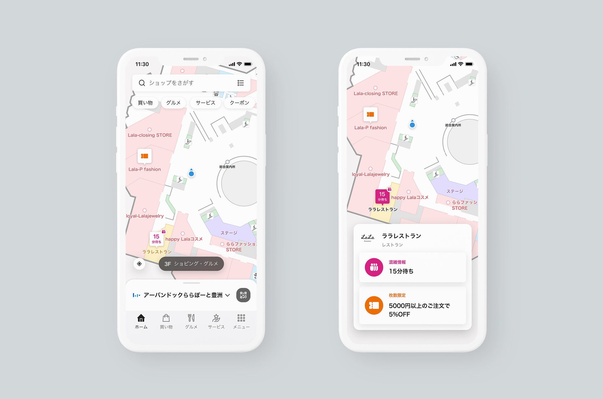 位置情報と連動して周辺にある店舗、設備を簡単に確認でき、分断されやすい情報・特典や、その場で利用する機能をまとめることで、ユーザーが探さずとも、施設滞在中の体験により集中できる設計の、デジタルフロアマップを導入しました。ららぽーとや三井アウトレットパークなどの全国約60の商業施設で利用できます