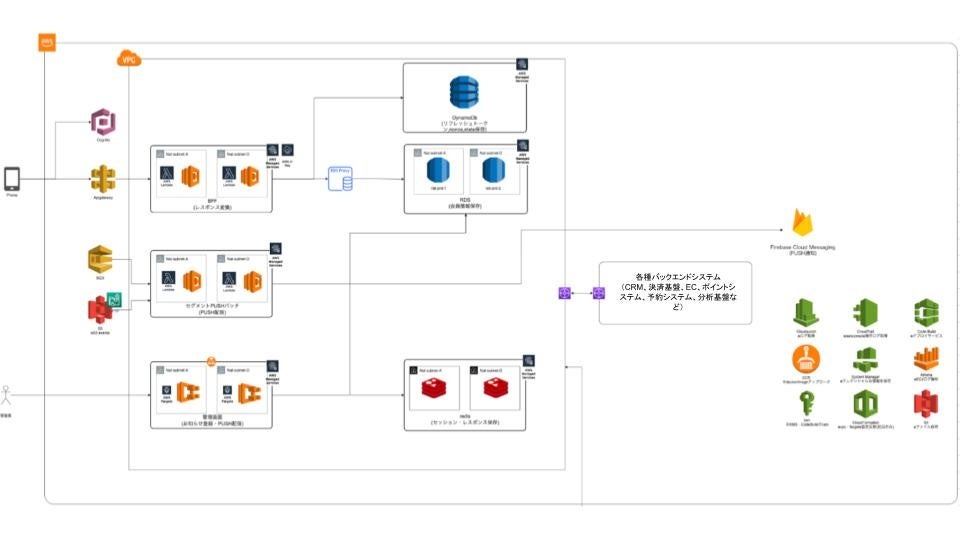 多様なサービスや機能をスムーズに提供するため、複数のバックエンドシステムを束ね、フロント向けに最適なAPIを提供するアプリ基盤を構築。インフラはAWSのマネージドサービスを最大限活用することで、負荷に応じて最適なサービスを提供します。