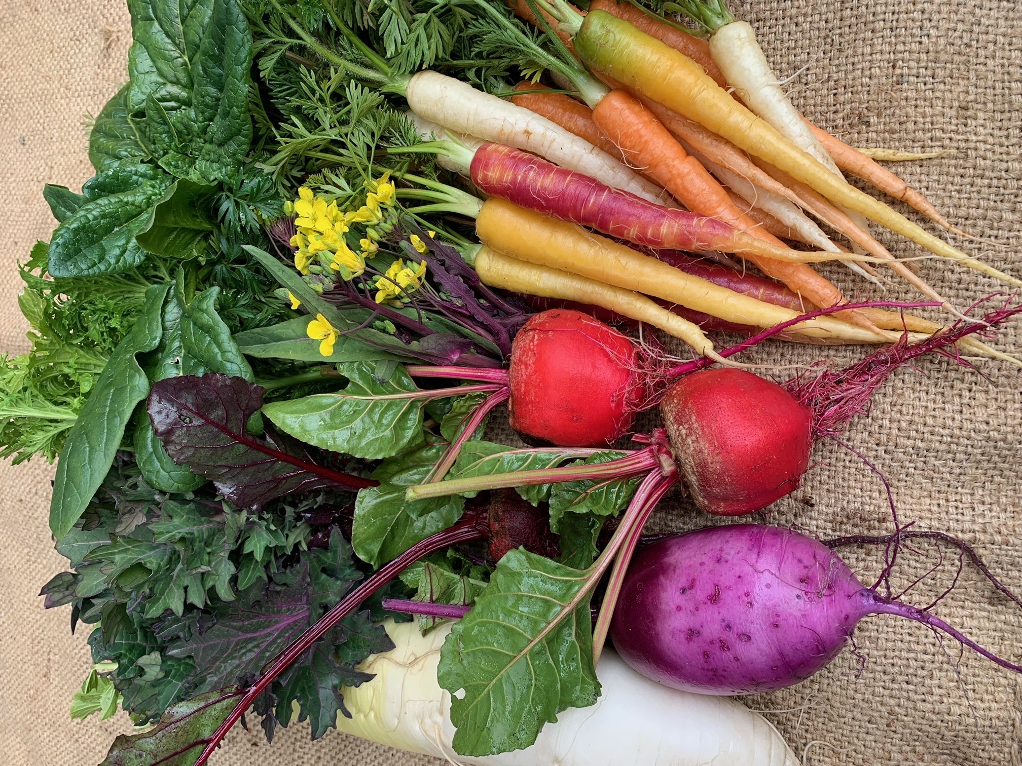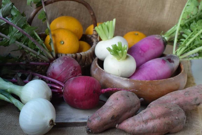 〈大根、ビーツ、ケール、ほうれん草、わさび菜、サツマイモ、唐辛子、ネギ、カラフルニンジン、黒米〉