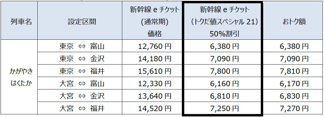 〇JR東日本は、2024年10月1日(火)から12月31日(火)まで開催される「北陸デスティネーションキャンペーン(以下、北陸DC)」にあわせ、北陸新幹線「かがやき」「はくたか」にえきねっと会員限定のおトクなきっぷ「新幹線eチケット(トクだ値スペシャル21)」(50%割引)を設定します。 〇ぜひこの機会に、北陸新幹線に乗っておトクに快適に、魅力あふれる北陸エリアの旅をお楽しみください。 |