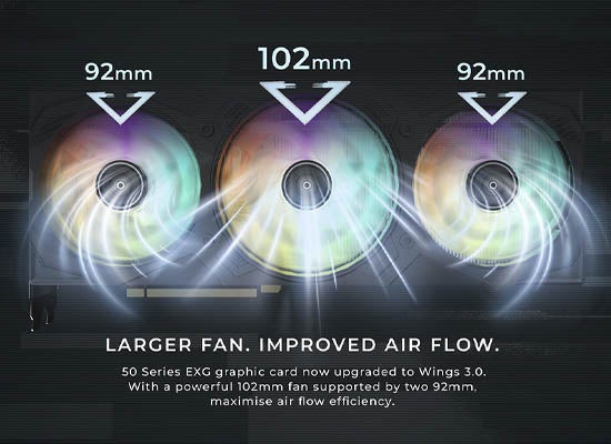 オリジナルファンブレード「WINGS」の3連ファンにより、グラフィックボードの発熱を抑え、パフォーマンスを発揮する際も安定動作。