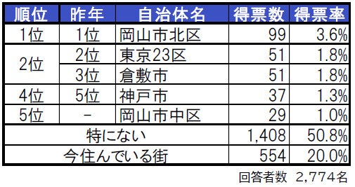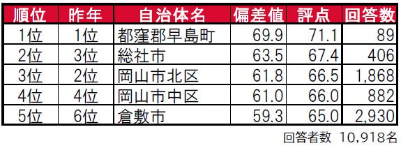 上位には岡山市内の自治体(北区・中区)と、都窪郡早島町や総社市、倉敷市など、岡山市周辺の自治体が選ばれています。