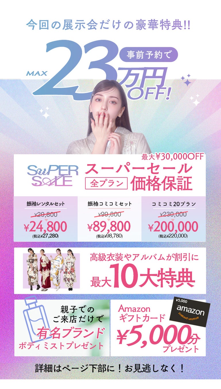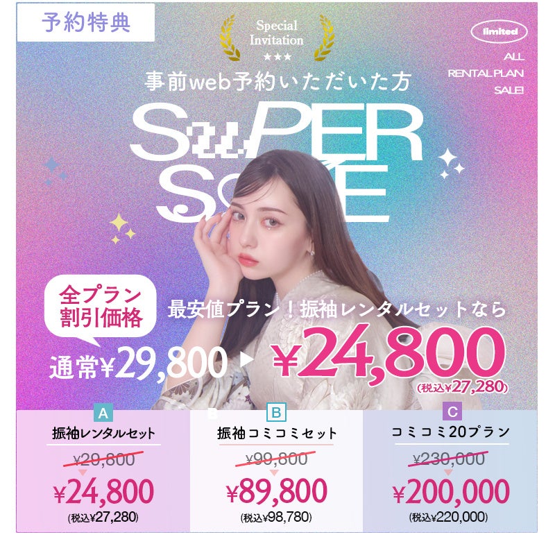 さらにスーパーセールで全てのプランが割引に。最安プランの振袖レンタルセットは¥24,800+税からご案内が可能です。
