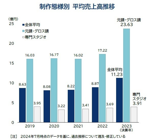 2023年の制作会社1社当たり平均売上(収入)高は11億2300万円だった。21年には減少に転じたものの、22年以降2年連続で増加した過去最高となった。ただ、平均売上高は「元請・グロス請」で増加が顕著な一方、下請となる「専門スタジオ」では小幅の伸びにとどまるなど、制作態様によって差がみられた。