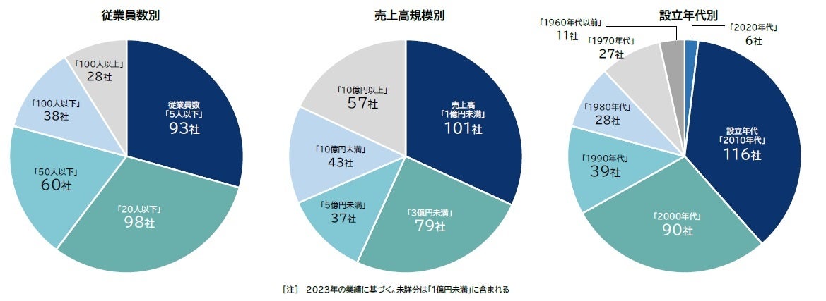 売上高規模で最も多いのは「1億円未満」(101社)で、全体の約3割を占めた。2023年調査に続き、新興の小規模制作会社が増加している。一方で、売上高が10億円を超える企業も57社と約2割を占めた。