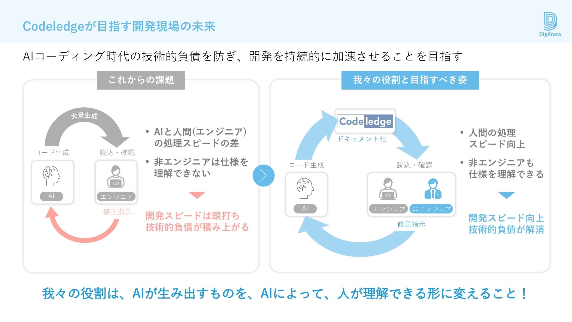 「Codeledge」は、AIコーディングが主流となる時代で「理解できないコード(技術的負債)の増大」を防ぎ、AIが生み出す成果物を人が理解できる形へと変換することを目指しています。