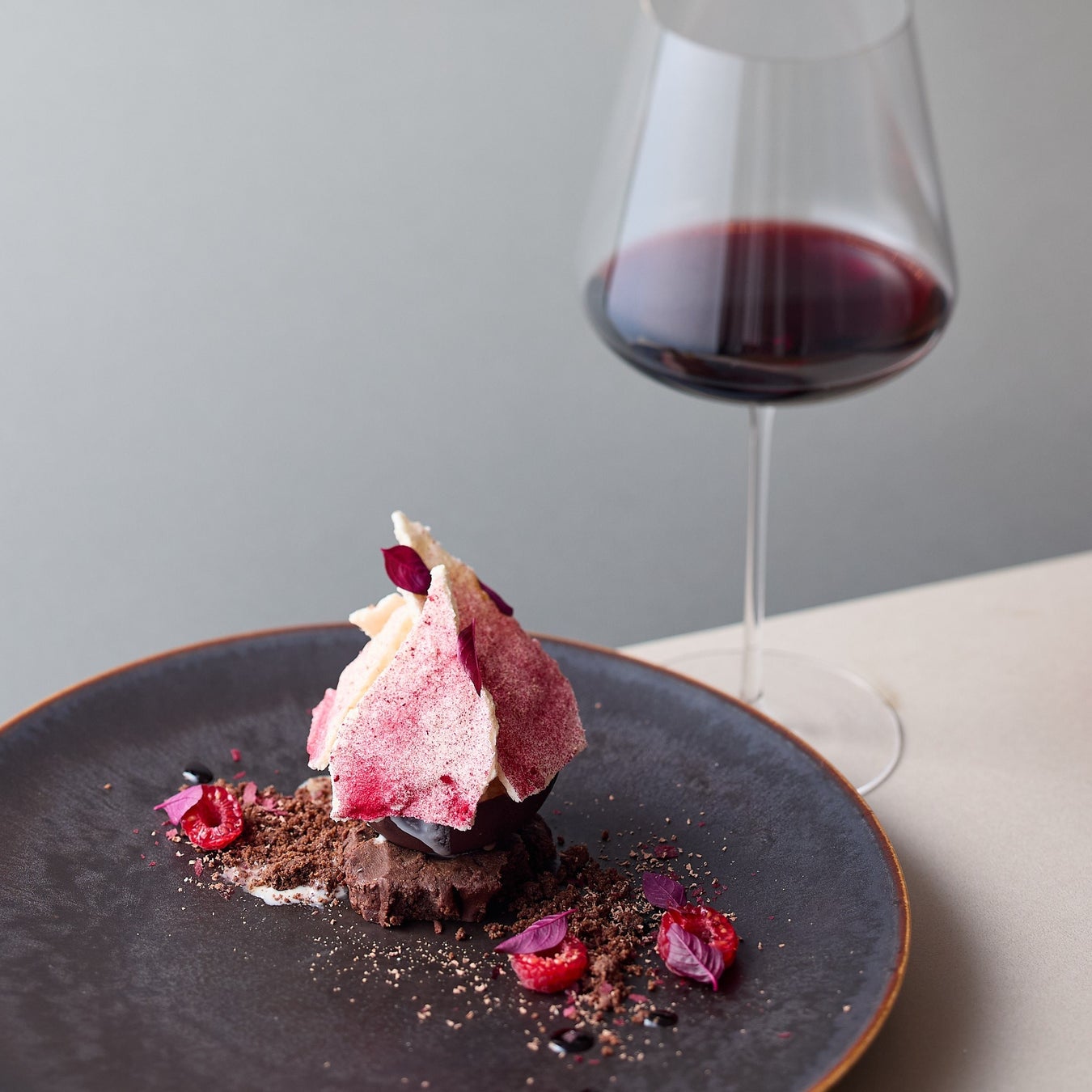 『ゴ・エ・ミヨ2023』(※)でベストパティシエ賞を受賞した際に授賞式で提供されたデザート。バヌアツ共和国のマレクラ島のビーントゥーバーチョコレートを使用。パプリカやバルサミコ酢でチョコレートの味わいを表現した延命寺シェフのスペシャリテ。