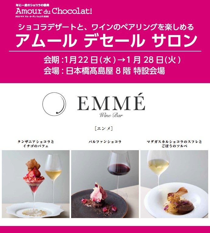 日本橋高島屋のバレンタイン催事「アムール・デュ・ショコラ」に、国内トップクラスの人気パティシエ 延命寺美也氏の<EMMÉ>(エンメ)が初登場。お客様の目の前でデザートやパフェメニューを仕上げて提供する「アムール デセール サロン」 (イートイン)が期間限定で登場いたします。