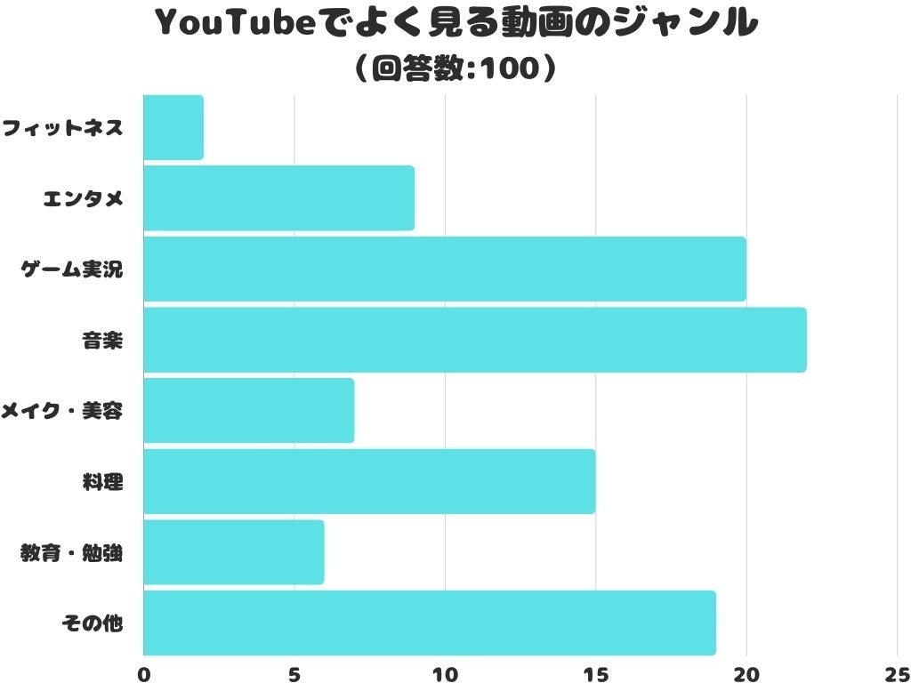 YouTubeでよく見る動画のジャンルをアンケートにて調査したところ、1位は「音楽」でした。