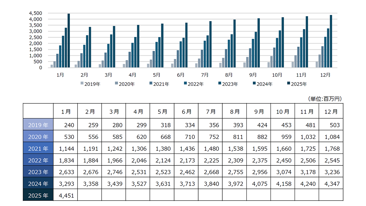 (注)ARR(Annual Recurring Revenueの略称で、契約更新のタイミングで全て更新される前提で、1年間で得られると想定される売上高)は、決済手段により3か月毎に1か月の日数(通常月は28営業日、特別月は35営業日)に変動があること、四半期決算期末月毎に決算調整を行っていること等から、月次では金額が変動するため、3か月移動平均を採用しております。