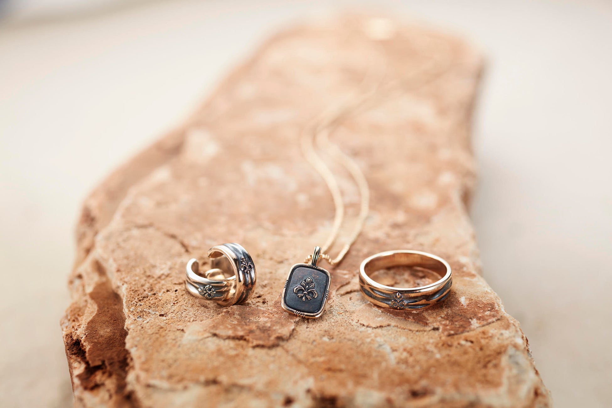 温かな色合いを生かしたボリュームあるK5ジュエリーは、敢えて黒く変色させる加工を施してクールな印象をプラス。紋章をかたどったモチーフと、クラフト感のあるテクスチャーがヴィンテージ感溢れる仕上がりで、いつもとは違ったゴールドのジュエリーをを楽しめます。