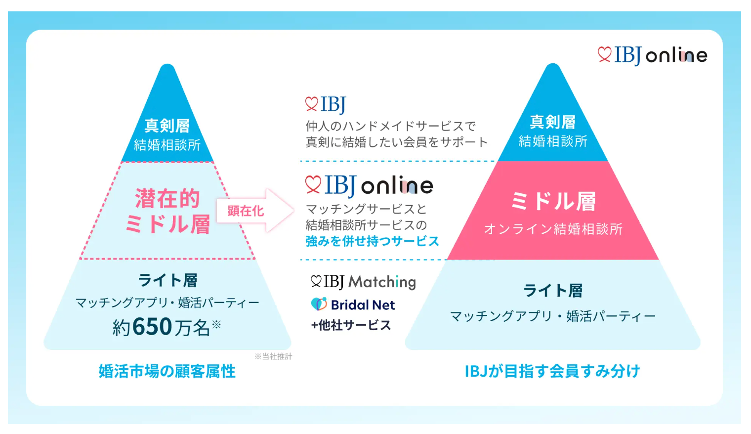 マッチングアプリなどのライト層と、対面型の結婚相談所を利用する真剣層の間に位置する“婚活ミドル層”を主な対象とし、「結婚相談所の真剣度」と「オンラインサービスの手軽さ」を両立した仕組みを提供します。