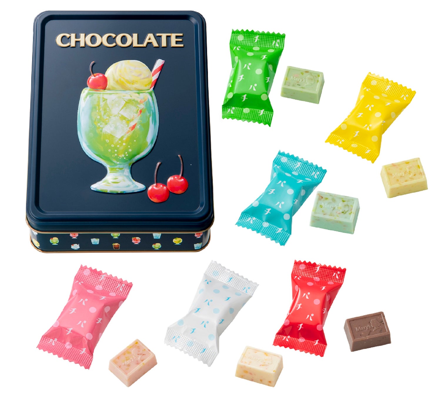 メロンクリームソーダやホワイトソーダなど6種類すべてのはじけるキャンディインチョコレートをレトロな缶に集めました。