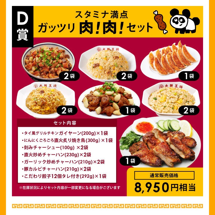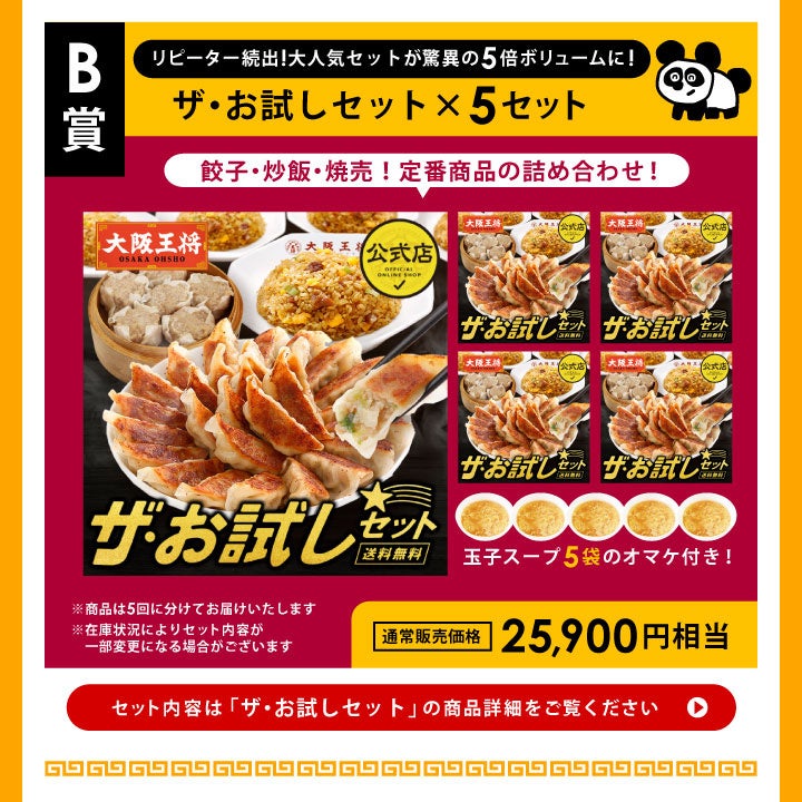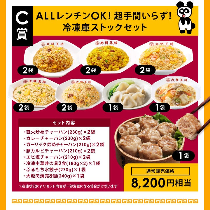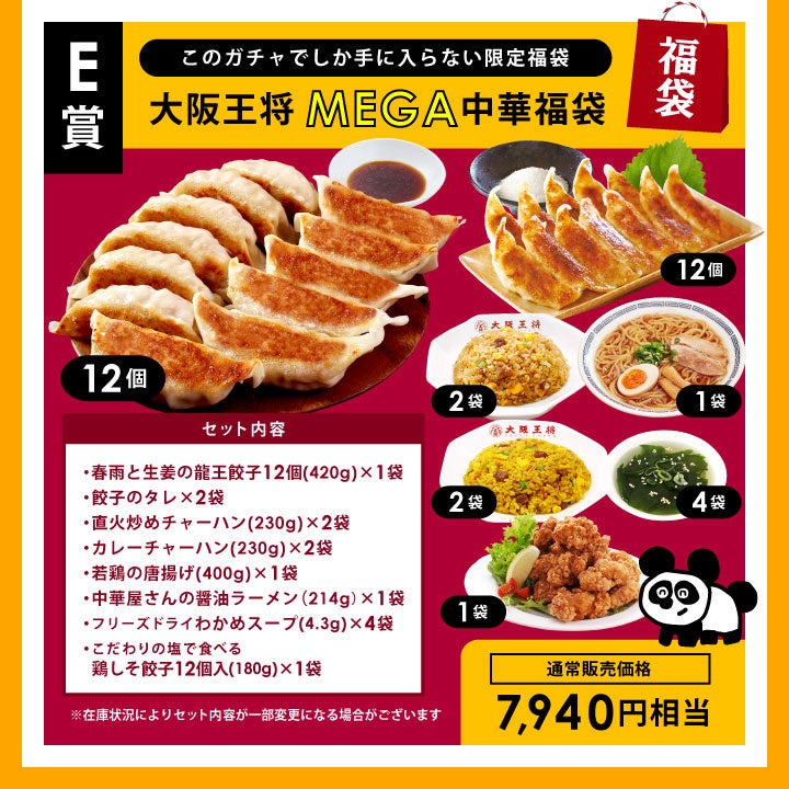 大阪王将公式通販サイトで「MEGA中華 ガチャ」をご購入いただくと、最大82,540円相当の「餃子1000個&チャーハン100人前(A賞)」などの人気中華惣菜がランダムで当たる大好評のキャンペーンを今年も実施いたします。