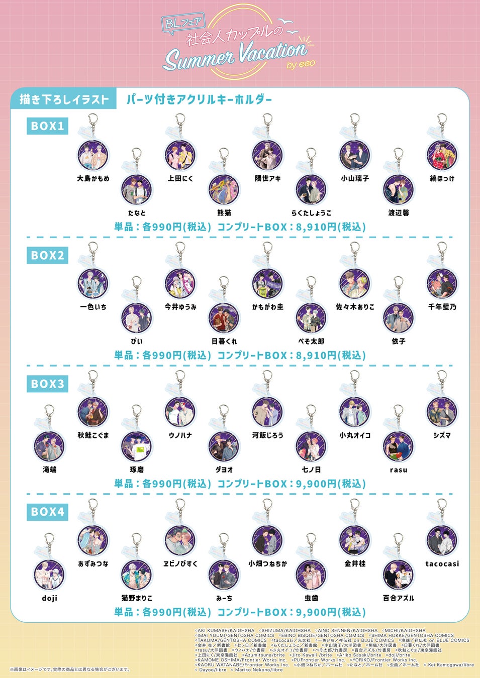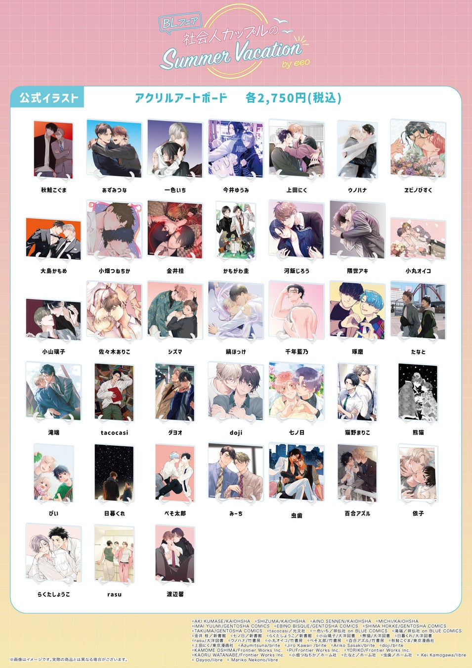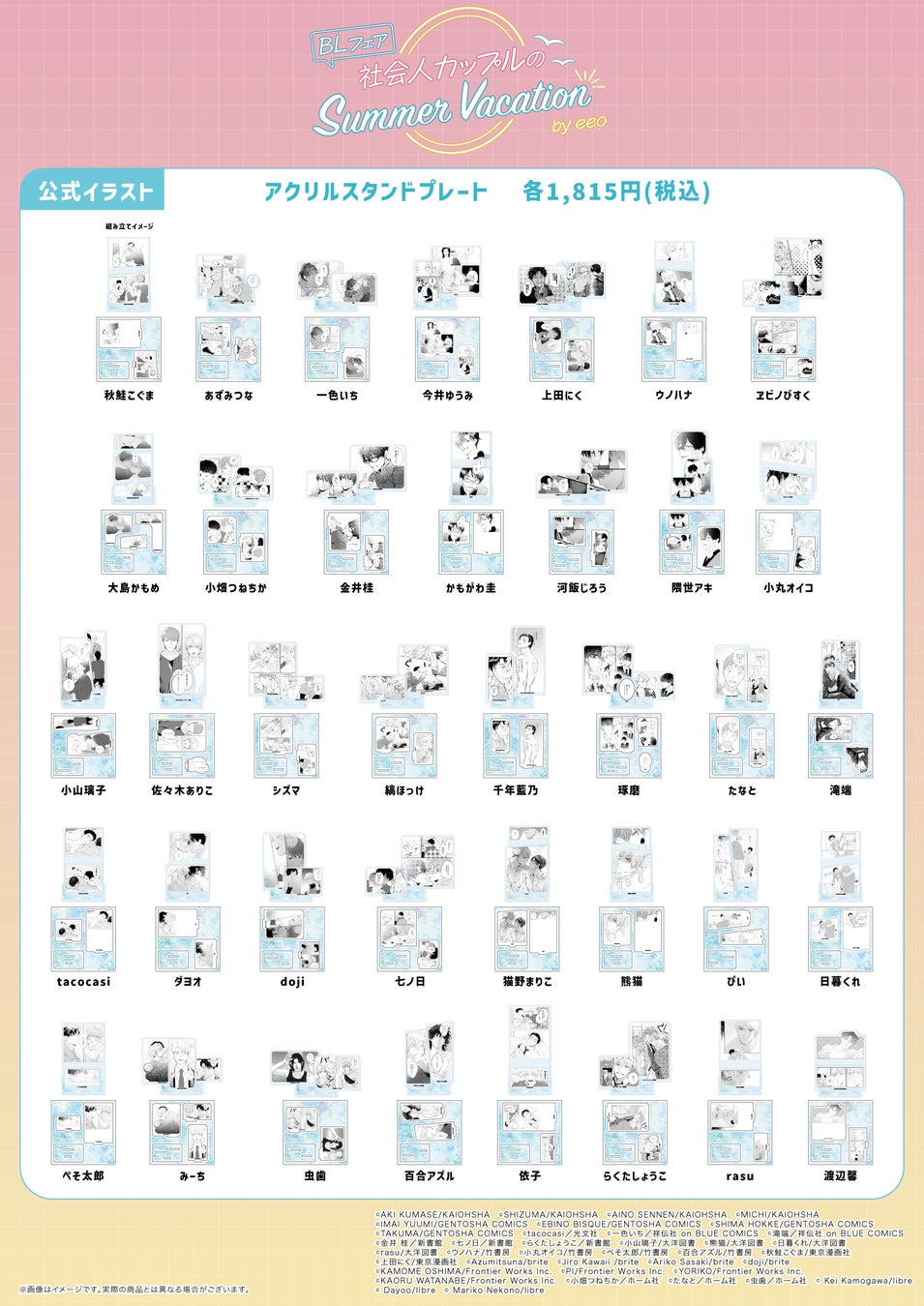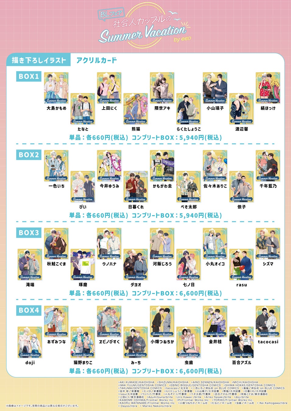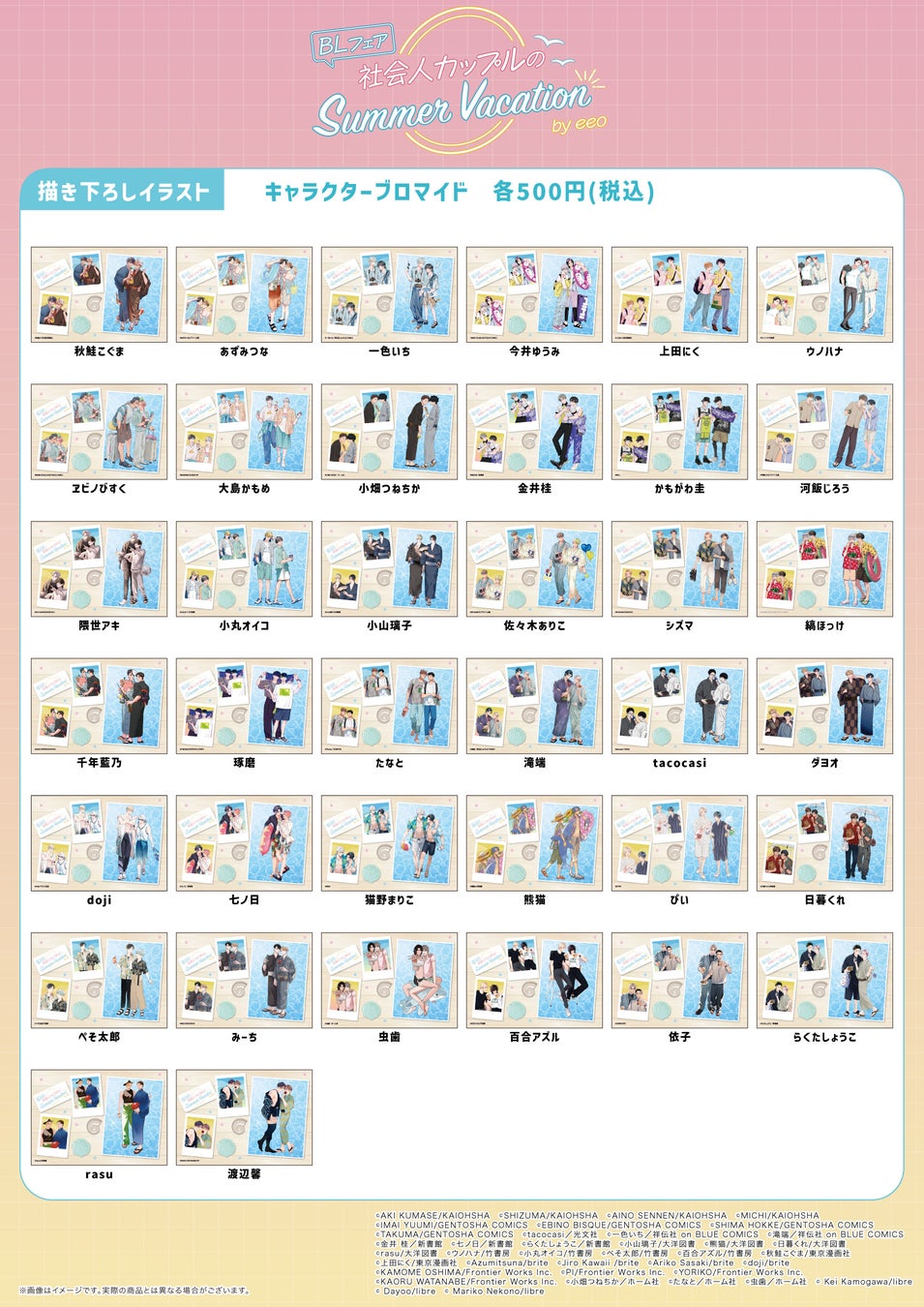 BLフェア「社会人カップルのSummer Vacation」by eeo新商品およびコミックスを2,200円(税込)お買い上げごとに、ポストカード(全38種)を購入特典としてランダムで1枚プレゼント! 通販および店舗で購入した方が対象です。ぜひグッズと一緒に飾ってお楽しみください!!