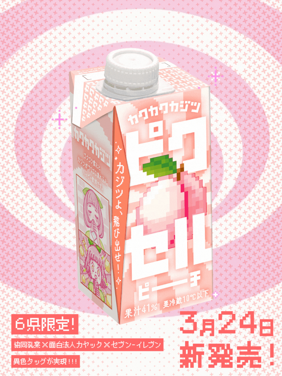 協同乳業株式会社(本社:東京都中央区、代表取締役社長:深松 聖也)と株式会社カヤック(本社:神奈川県鎌倉市/代表取締役CEO:柳澤大輔/以下「面白法人カヤック」)、株式会社セブン‐イレブン・ジャパン(本社:東京都千代田区、代表取締役社長:阿久津 知洋、以下「セブン‐イレブン・ジャパン」)は、果肉の食感を「ピクセル」として楽しむ新発想の果汁飲料「カクカクカジツ ピクセルピーチ」を共同開発しました。2026年3月24日(火)より、千葉県、埼玉県、広島県、鳥取県、島根県、山口県の6県限定でセブン-イレブン店舗にて期間限定で発売を開始します。