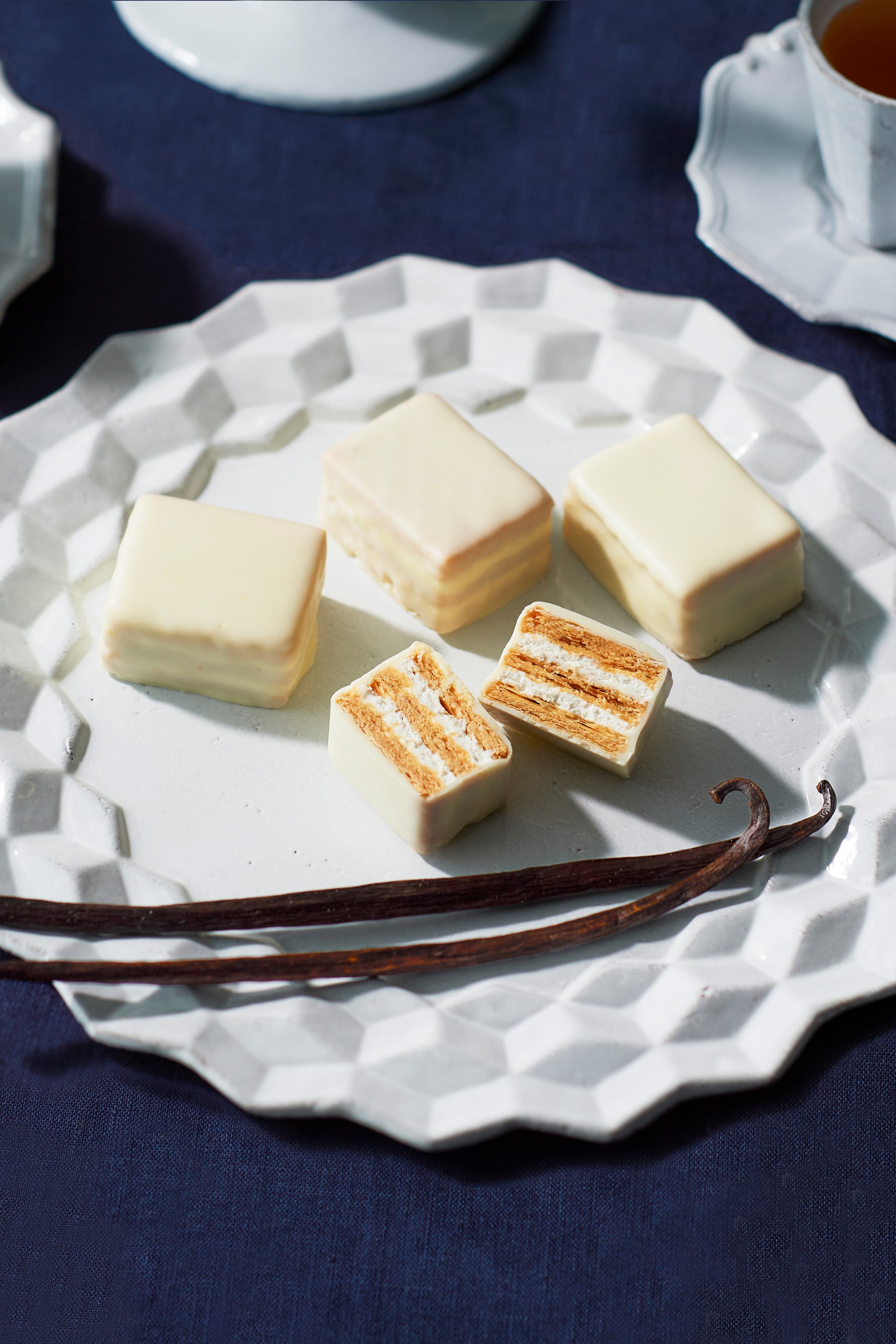 間にはバニラ風味のチョコレートをはさみ、繊細なバニラの香りを重ね合わせました。