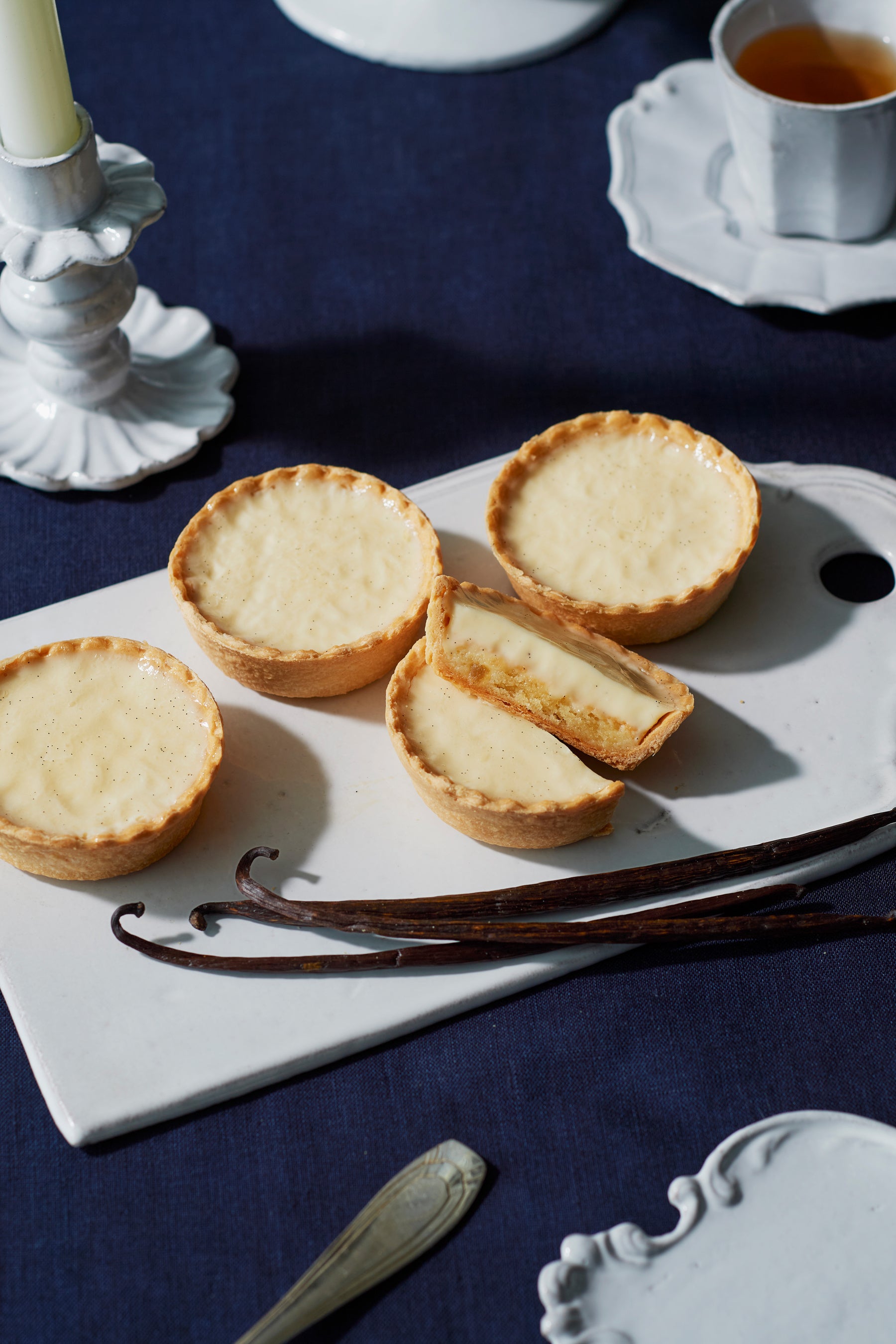マスカルポーネチーズにバニラを加えた、とろりとなめらかなバニラクレームを楽しむタルトです。濃厚なダマンド生地にはレモンピールで爽やかな香りのアクセントを。