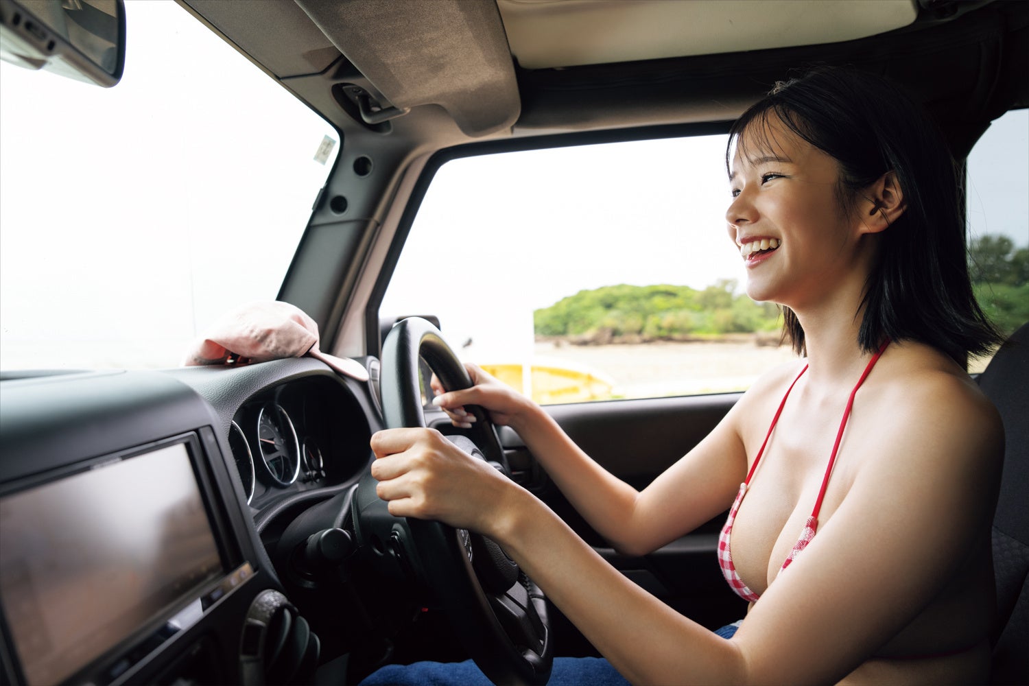 最強ポテンシャルの理由は、ページを開けば一目瞭然。可愛さ爆発のルックスだけでなく、ビキニやドレスからはみ出さんばかりのGカップ、誰もがうらやむS字カーブを描くキュッと締まったクビレ、そして「こんなにセクシーだったの?」とスタッフをうならせたスーパーヒップ。