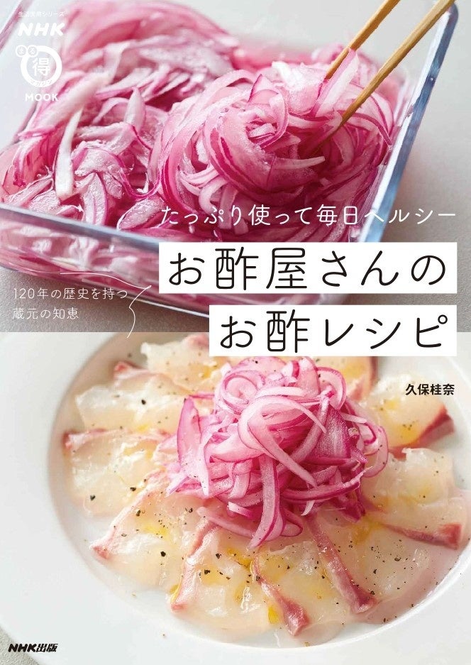 「NHKまる得マガジンMOOK たっぷり使って毎日ヘルシー お酢屋さんのお酢レシピ」では、明治33年創業の蔵元に生まれ、現在お酢生活研究家として活躍する久保桂奈さんが、蔵元ならではの知恵が詰まったレシピをたっぷりとご紹介。ちらしずしや焼きそばといった主食系から、柔らか肉の炒め物や煮物、バリエーション広がる万能だれ、ピクルスなどの常備菜、簡単にできるドレッシングや酢ドリンクまで、米酢、黒酢、穀物酢などそれぞれの酢の特徴を生かしたアイデアメニューが満載です。