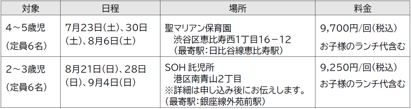 今回は、東京メトロ沿線の2か所の保育園で、7月23日(土)、30日(土)、8月6日(土)、21日(日)、28日(日)、9月4日(日)の計6日間、イベントを開催します。お子様が「地下鉄」に触れ、学びを深めている間、毎日家事・育児・仕事等で中々ご自身の時間が持てていないお父様・お母様は、ぜひ東京の街へのお出かけ(City Tourism)をお楽しみください。