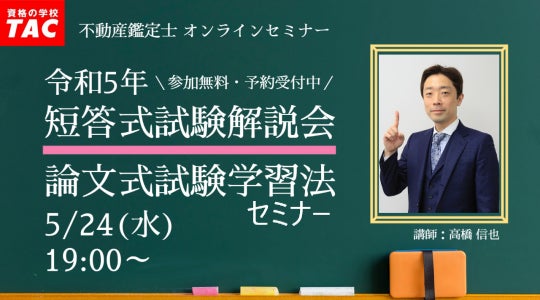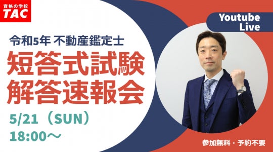 不動産鑑定士、宅建士、司法書士、日商簿記検定、公認会計士、公務員などの資格取得に向けた教育サービスを展開しているTAC株式会社(東京都千代田区、代表取締役社長:多田敏男)は、5/21(日)実施の不動産鑑定士試験短答式試験の解答速報会を、5/21(日)18:00からYouTube Liveにて開催いたします。