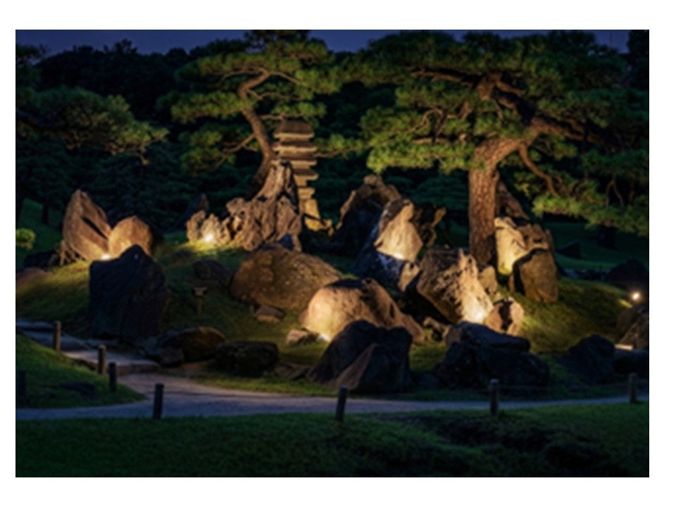 旧芝離宮恩賜庭園は、江戸初期に造られた大名庭園の一つで、回遊式の泉水庭園です。かつて海であった場所を埋め立てて造られ、往時は海から大泉水(池)に海水を取り入れ潮の満ち引きとともに景色が移ろいました。石、山、池、木々のひとつひとつに、深い意思と歴史が宿り、それは今も静かに息づいています。今回は、庭園全体のライトアップにとどまらず、景石、築山、池、浜、島などにスポットライトを当て、大泉水や勇壮な石組に、海面や往時の潮の満ち引きを彷彿とさせる幻想的な風景を演出します。