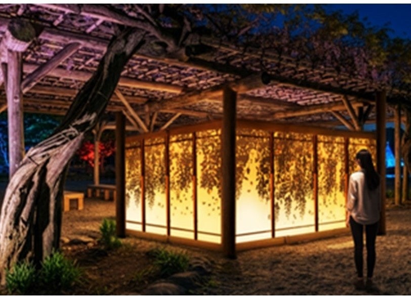 光に浮かび上がる藤の花を通して、庭園に息づく記憶を演出し、都市の喧騒から静かな庭園の世界へ誘います。