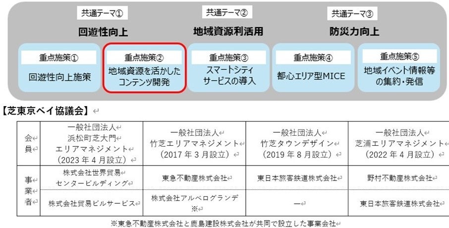 芝東京ベイ協議会では、本地区の共通の地域課題に対して、以下のテーマで施策を実施しております。本イベントは『重点施策②地域資源を活かしたコンテンツ開発』に該当する取組です。今後も、歴史と未来、陸と海が交わる、東京でも魅力あふれる「芝東京ベイ」を舞台に、生活する方や働く方、訪れる方に対してより魅力的で便利な体験にあふれるまちづくりを目指し、重点施策の活動を進めてまいります。