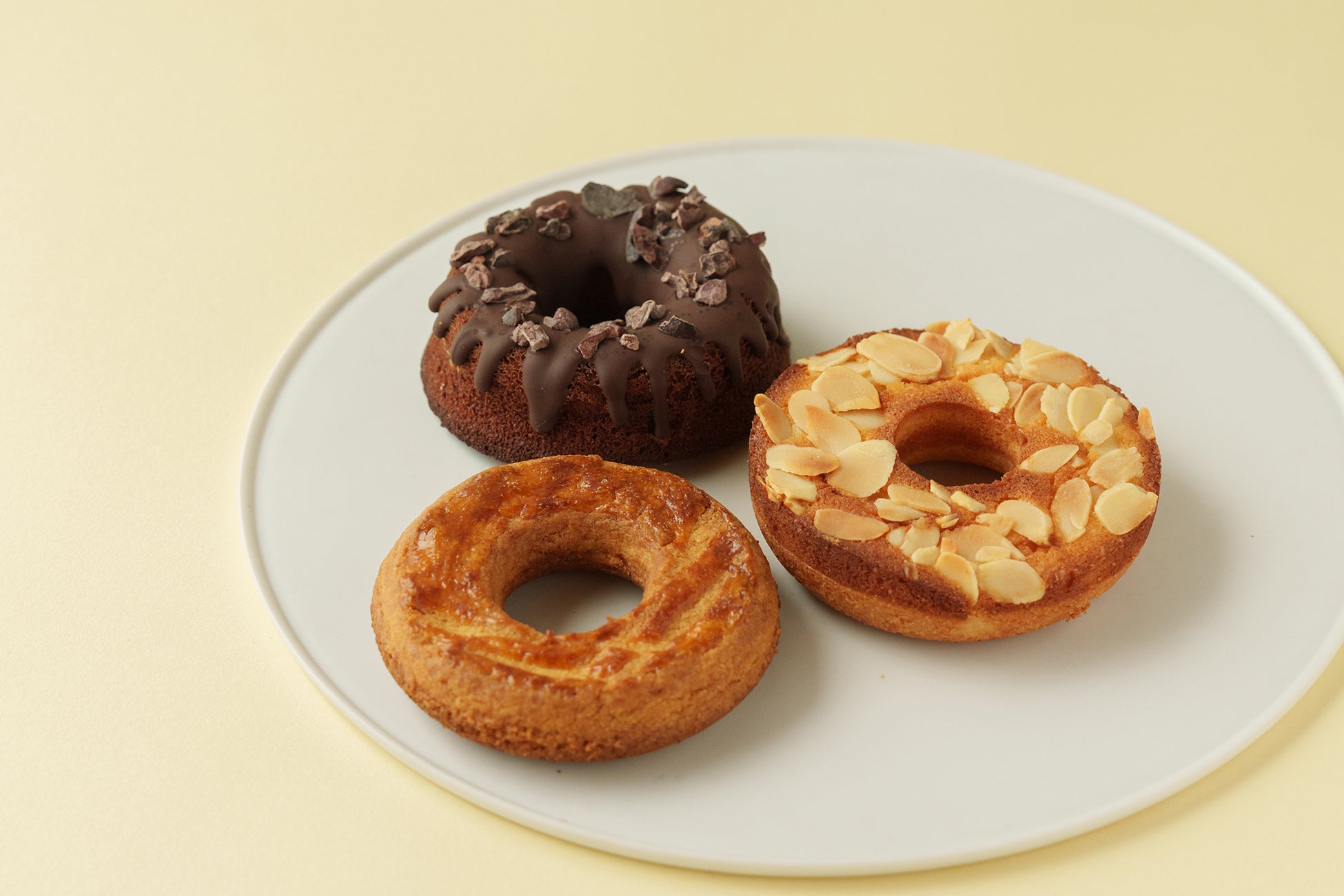また、希少な「蒜山ジャージーバター」を使用して焼き上げた、香り豊かなベイクドーナツの3個入りセットが発売。アーモンドをのせたドーナツ生地にオレンジとラム酒がほんのり香る「タルト アマンディーヌ」、オーガニックココアを練り込んだ「オーガニック チョコレートケーキ」、ほろっとした食感が厚焼きサブレのような「ガレットブルトンヌ」をラインアップ。店舗とオンラインストアにてご購入いただけます。