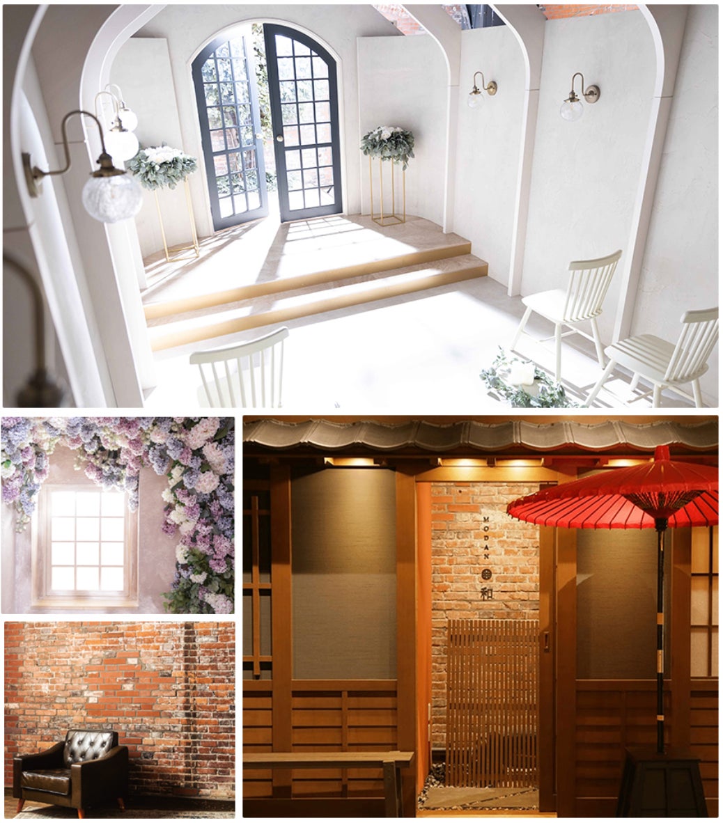 各店舗にはどんな振袖でも映える本格和室を完備。その他おしゃれなデザインスタジオなどバリエーション豊かなスタジオセットでの前撮り撮影が可能です。