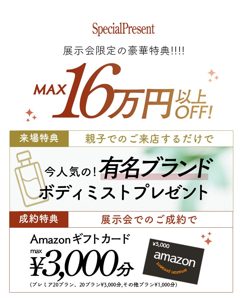 親子で来店するだけでもらえる有名ブランドのボディミストや、amazonギフトカード最大¥3,000プレゼント。