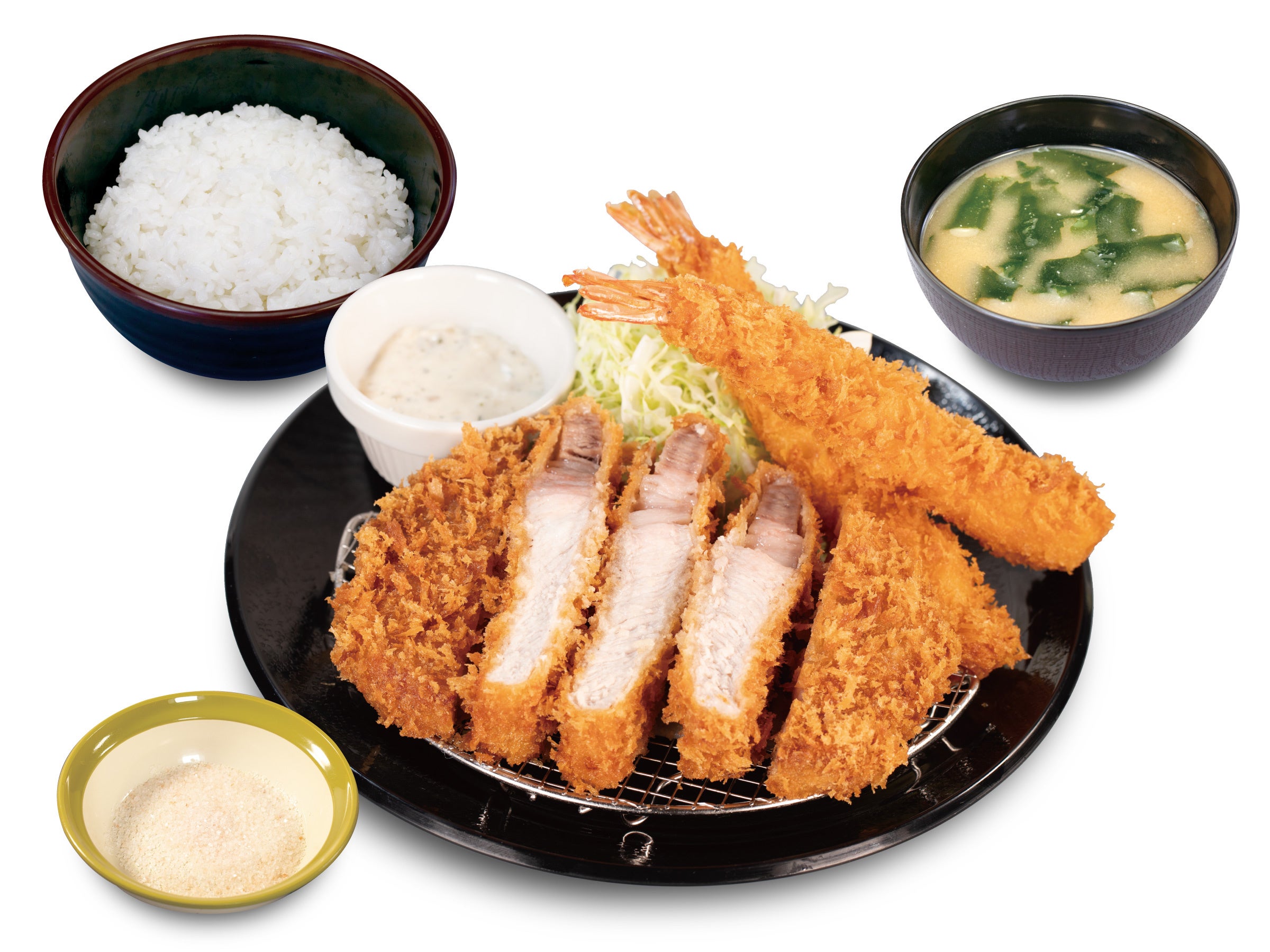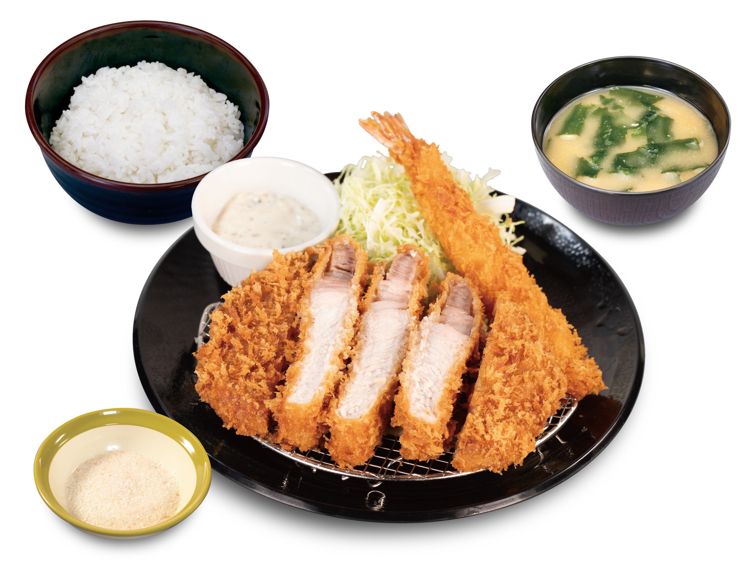㉓“大麦豚”厚切りリブロースかつ&海老フライ2尾定食 1,530円