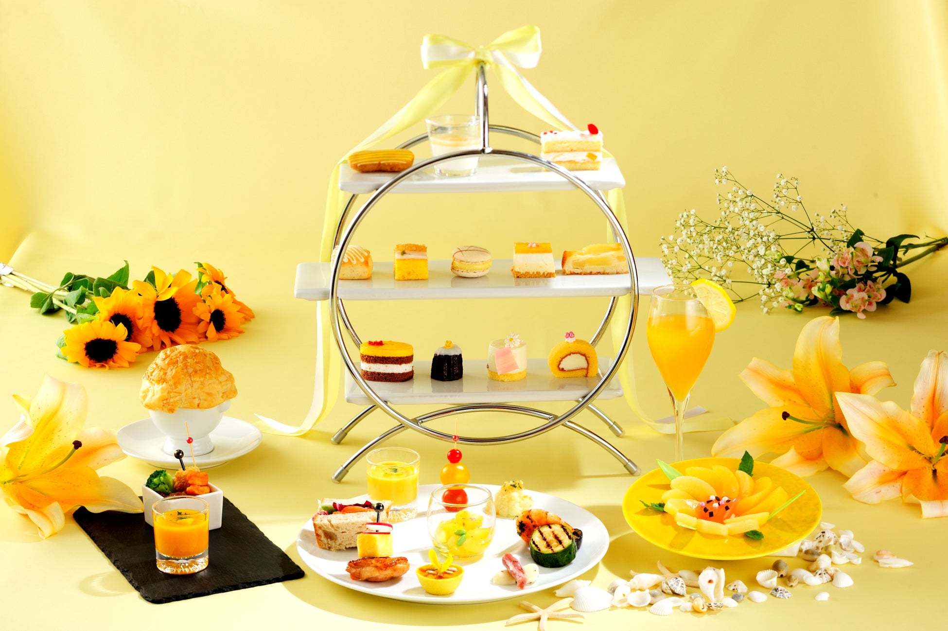 見た目にもこだわり、黄色と白をテーマにした華やかな彩りのスイーツを多数ご用意。フルーツをふんだんに使用した、「桃のショートケーキ」、「杏仁のブランマンジェと白桃のソース」、「マンゴーとライチのガトー」などがアフタヌーンティースタンドに並びます。