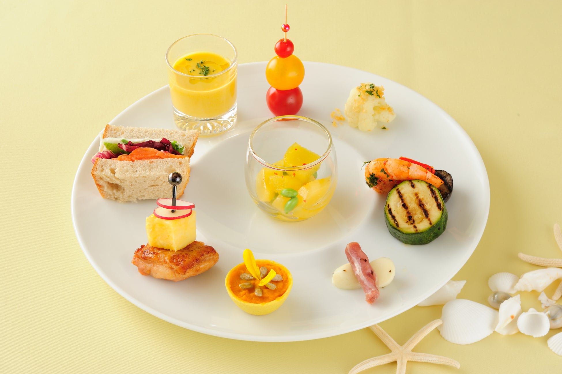 アフタヌーンティーの始まりは、夏の夕陽をイメージしたオリジナルカクテル「サンセットスマイル」から。見た目にも爽やかな一杯で、心踊る午後のスタートをお楽しみください。続いて、「とうもろこしのコールドスープ」、「チキンとパイナップルのピンチョス ココナッツ風味」、「スパイスをきかせたガーリックシュリンプ」など、華やかなセイボリーメニューをご用意。